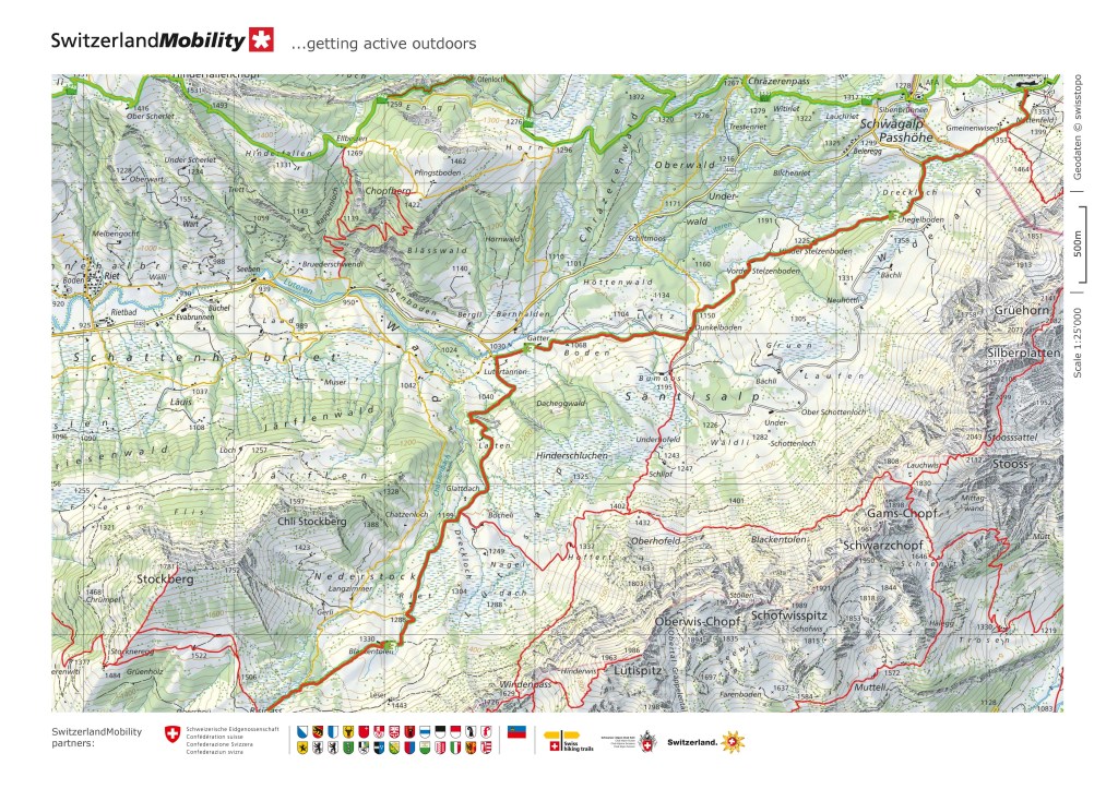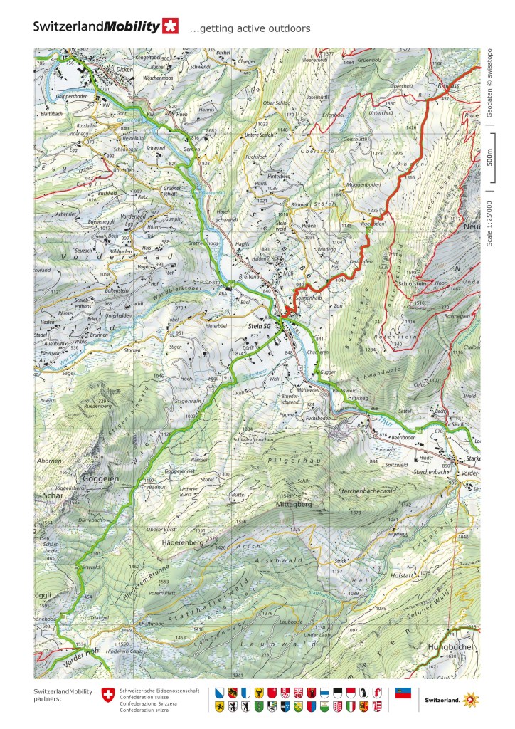 The route goes steadily downhill from the Risipass. At times, looking westwards, it seemed like the route was going too steep, but each time, it managed to find the best terrain, and kept a more gentle downward trajectory. Eventually, the village of Stein SG came into view. The entire valley seemed to be under a cover of snow. In the snow, I wandered slightly off the trail at one point, but once again, GPS helped be get back on course. Eventually, I reached Stein SG, with a bit of time to wait for the bus that would start the journey back to Basel. It was -3°C in Stein at three o’clock in the afternoon. I could only guess what the temperature must have been on the higher ground at the pass.