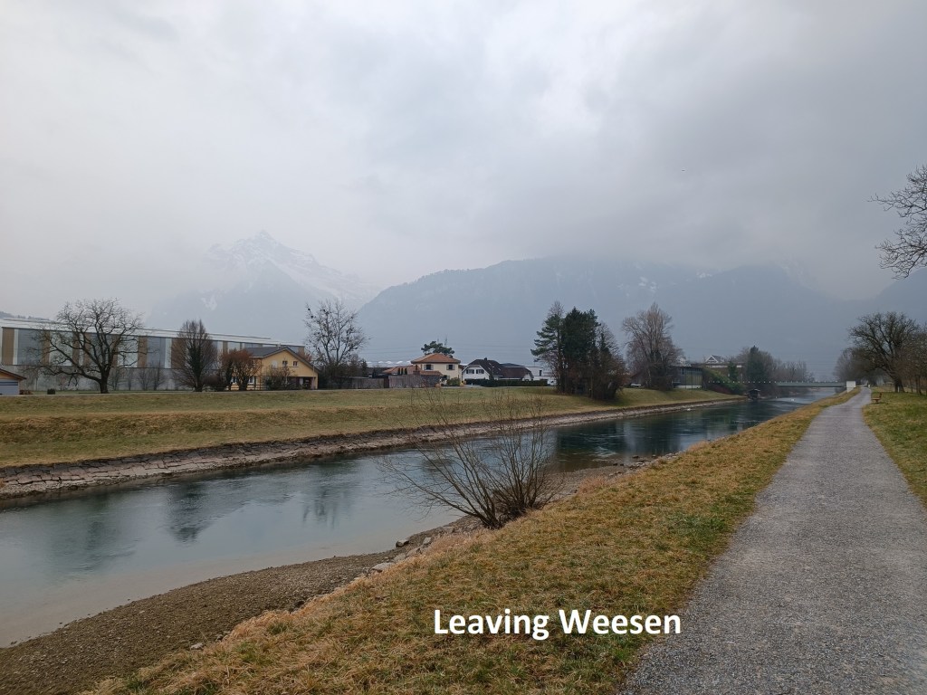 So now I am going to try to catch up on things. When last I wrote, I described reaching the little village of Weesen on the shore of the Walensee. So it was natural that my next stage of the walk would start from there. On a march morning, with the mist shrouding the mountains, I alighted from the bus and set off on my way. The first part of my route for the day followed the Lithkanal. I understand that this used to be a river once upon a time, but the Swiss approach to water management has turned it into a canal. It is nevertheless a pleasant walk along the bank, with the canal on one side, and fields, then later forest, on the other.