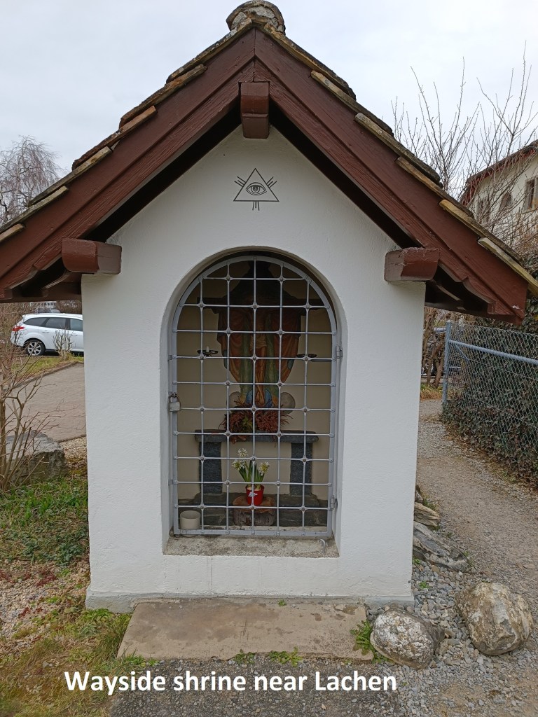 I continued on, past Galgenen and Steinegg, where I found a small shrine decorated with the all-seeing eye. And then I was coming into Lachen. The Alpine Panorama Trail branches off to the left on what would be my next stage of the route, but I went on into the town with the Via Jakobi to reach the train station and the start of my journey back to Basel.