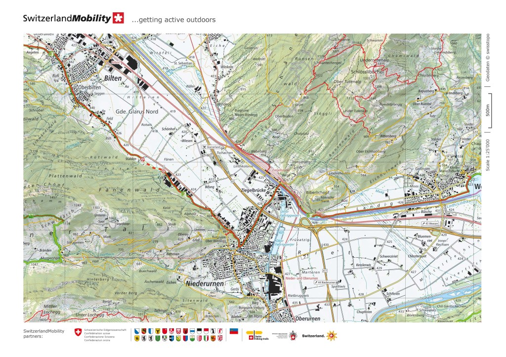 And so I came to Ziegelbrücke.. The trail turns away from the canal at that point, heading towards the town of Niederurnen. However, just as it comes to the town, the trail takes a sharp right turn and heads out into the countryside again. Not far out of Niederurnen, the map showed the trail as being blocked due to tree felling, but the location of that work was so specific, and the amount of work being done was so little, that I had no difficulty getting through.