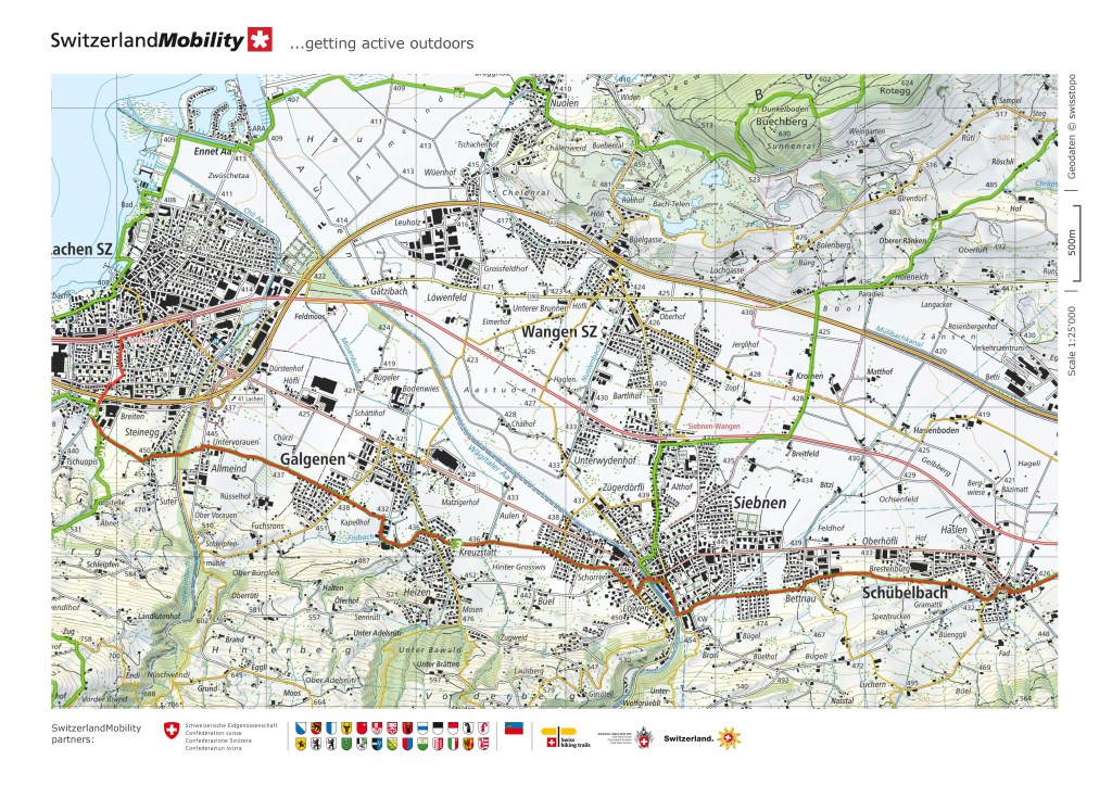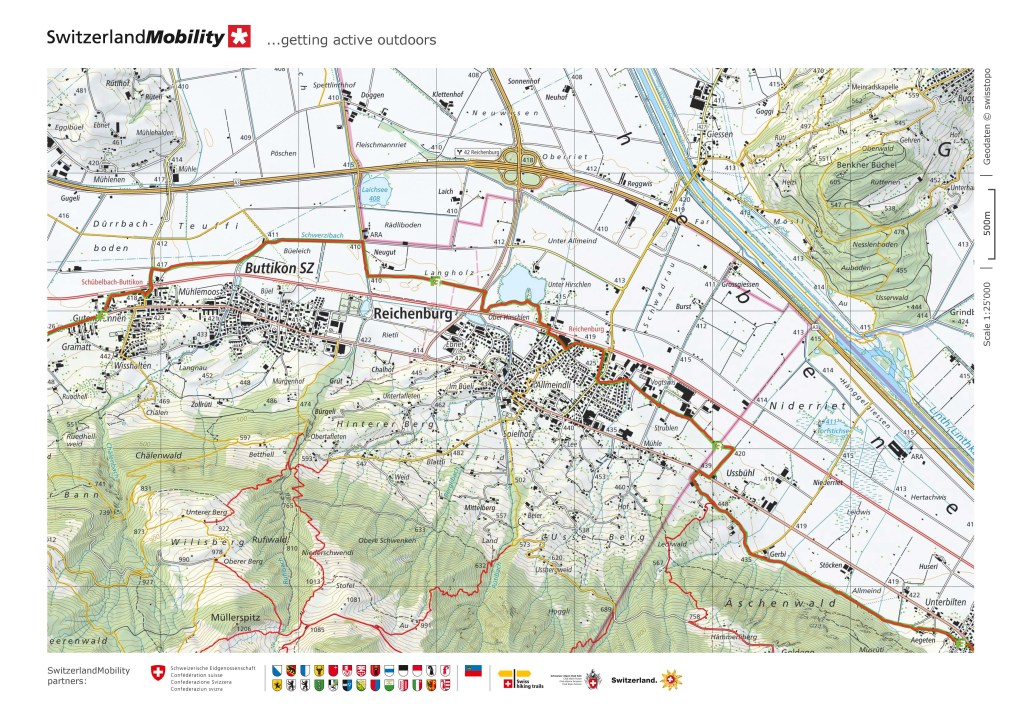 Approaching the railway crossing west of Buttikon, I came across an alpaca on the loose. That is not exactly what one expects to find in Switzerland, but there it was. Looking around, I saw close by a farm with more alpacas in an enclosure. I went up to the farm and knocked on the door, several times, but without answer. Meanwhile, the loose alpaca had followed me into the farm compound. That is as good as I can make it, I thought, and I left, taking care to close the gate on my way. I went on and soon came to Schübelbach.