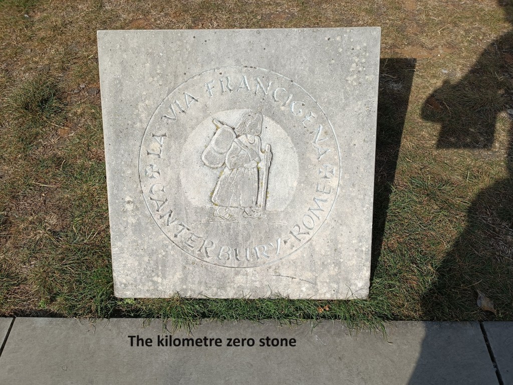 They also told me that my Pilgrim Passport gave me free entry to the Cathedral, so on I went into the Cathedral precincts. There I met one of the security people, or maybe he was simply an attendant there to help the many visitors. I wasn’t sure as to where the actual entrance to the Cathedral itself was, so he advised me, and we started chatting. He showed me the kilometre zero stone, the point that marks the beginning of the journey towards Rome. He also asked me why I was doing the journey, was it for religious reasons, or something else? I explained that it was more a matter of my own personal spirituality and inner wellbeing. That’s what most people say, he told me. He also told me that he runs an Instagram page with photographs of people as they start the pilgrimage. He asked if he could add my photo to the page, and I said certainly, why not. So somewhere on Instagram, there is a photograph of me standing beside the kilometre zero stone in Canterbury. He also advised me that if I was there at five o’clock, as a pilgrim, I would be allowed in to the Evensong service.