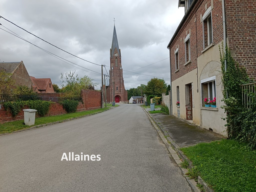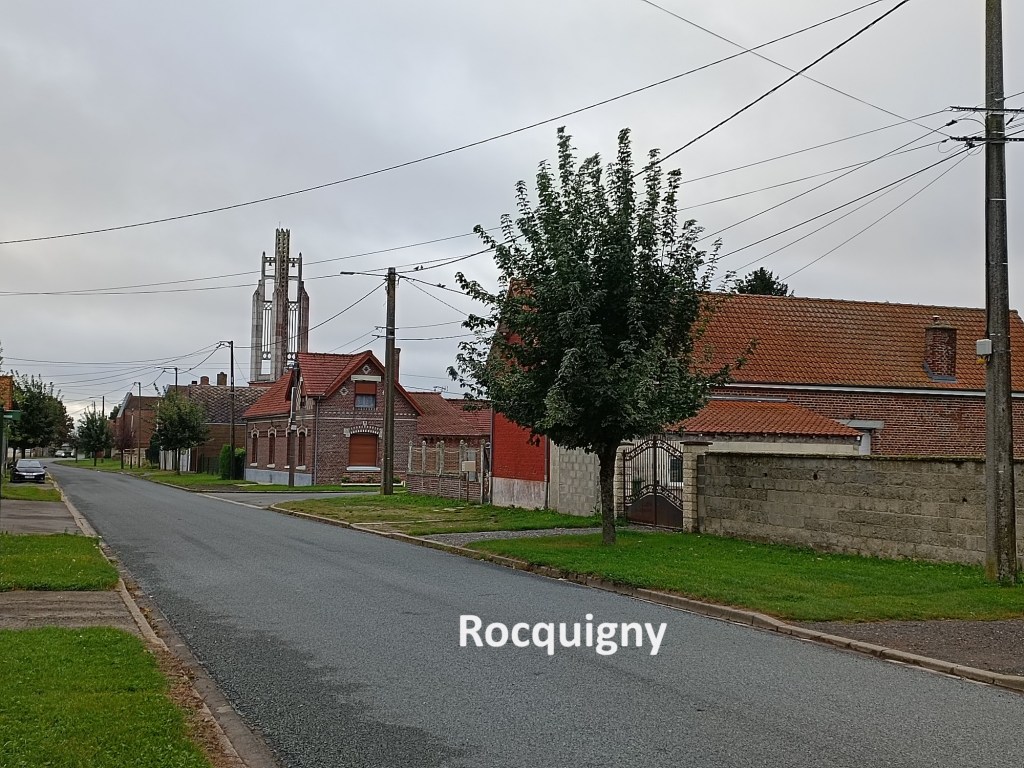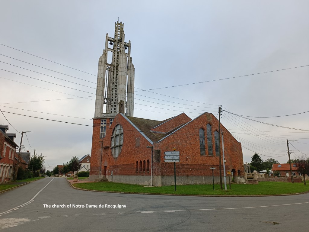 I rejoined the official trail not far from Villers-au-Flos, southwest of the village. It was a cool morning with a light wind, but quite pleasant. The skies were a mixture of blue and grey, but rain seemed unlikely. Once back on the official trail, I followed it into the village of Rocquigny. This is another village that was in the combat zone of WW1, and the church was completely destroyed. However, no French village seems complete without its church, and the new one was built in 1929, based on plans from the architect Jean-Louis Sourdeau. The design is an interesting composite of red brick and reinforced concrete. The bell tower is made from that latter material, and it must be said that it looks like something of an afterthought that was added to the building. In the 1990s, the church had deteriorated that its demolition was in prospect, but it was declared a national monument in 2001. This led to deconstruction and rebuilt, with the work completed in 2013.