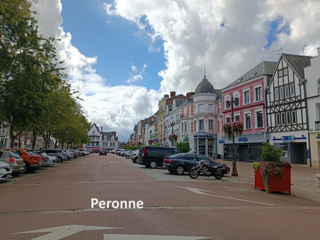 The trail makes a detour to cross the canal, and just touches the edge of the village of Allaines before going back out into the countryside again. After a few twists and turns, it reaches the edge of Peronne. After I crossed the D1017, I found a restaurant that was open, and since it was now after twelve noon, I stopped for lunch. After all, as I mentioned above, I had only had a light breakfast. Thus fortified, I went on to the centre of Peronne. Few towns in history can have had the violence that Peronne has endured over the centuries. Apart from Viking raids, it suffered a siege in 1536, was partially destroyed in the Franco-Prussian War of 1870, devastated and destroyed in WW1, and bombed in 1940. But it still survives. When it wasn’t being fought over, it was an important stopping point on both the north-south and east-west trade routes between France, Germany, and Belgium. Today, it is a relatively quiet market town.