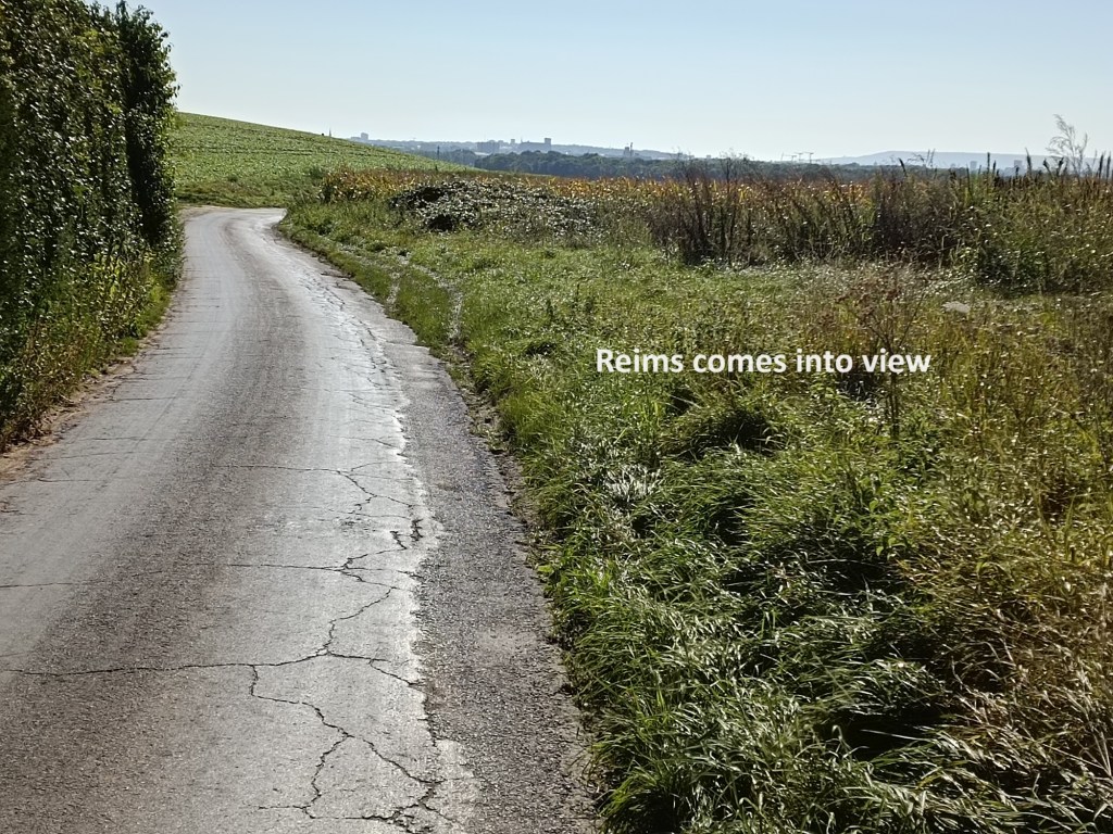 I followed the trail onward, at one stage going along a sunken road, with a canopy of fallen trees overhead. This brought me to the village of Merfy. This small village lay quiet in the morning sunshine, and I went straight through. Not long after came Les Maretz, which is no more than a tiny hamlet. Along the way, the city of Reims came into view for the first time.