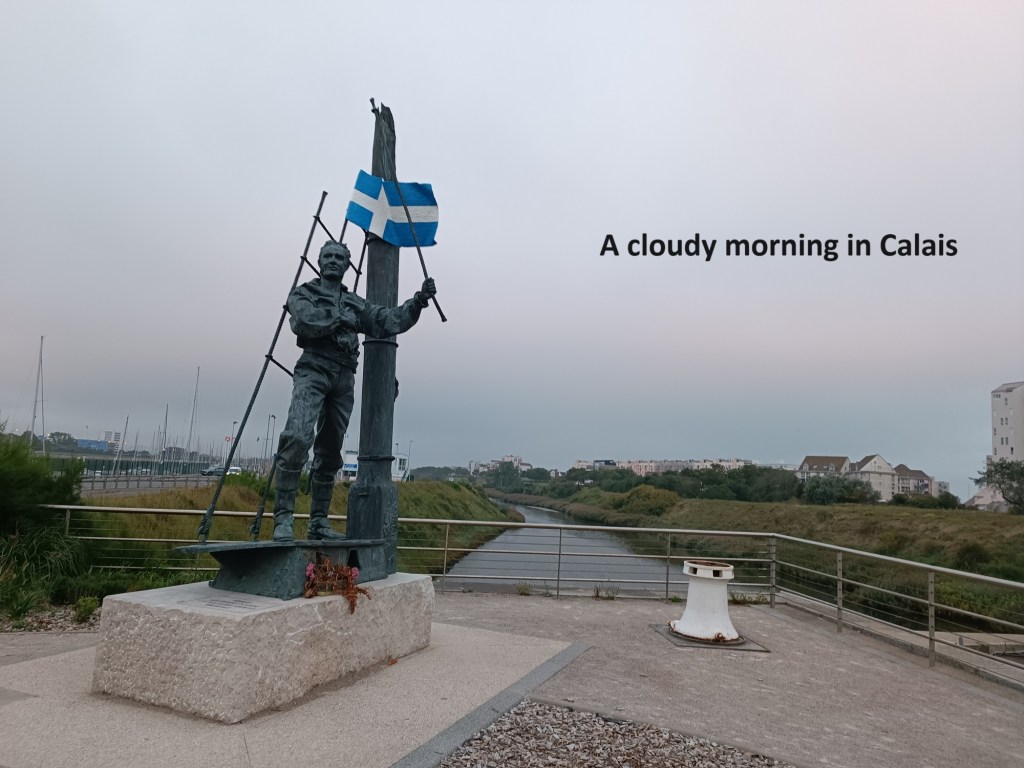 My accommodation had been close to the shore area in Calais, and the official route would have had me continue westwards along the shoreline of the channel. But I went back into the city. I had only seen a brief glimpse the evening before, and in the daylight, it looks much like any other major French city. I headed out on a cloudy morning, passed the statue of the sailor in the harbour, going on through the square in the city centre. I went on past the city hall, and turned left to bring me to the Canal do Calais, joining it at the Quai de Commerce. Children were going to school, people were out jogging, and commuters were going to their jobs. I was walking south along the quays. Eventually, I was out of the inner city, and on my way.