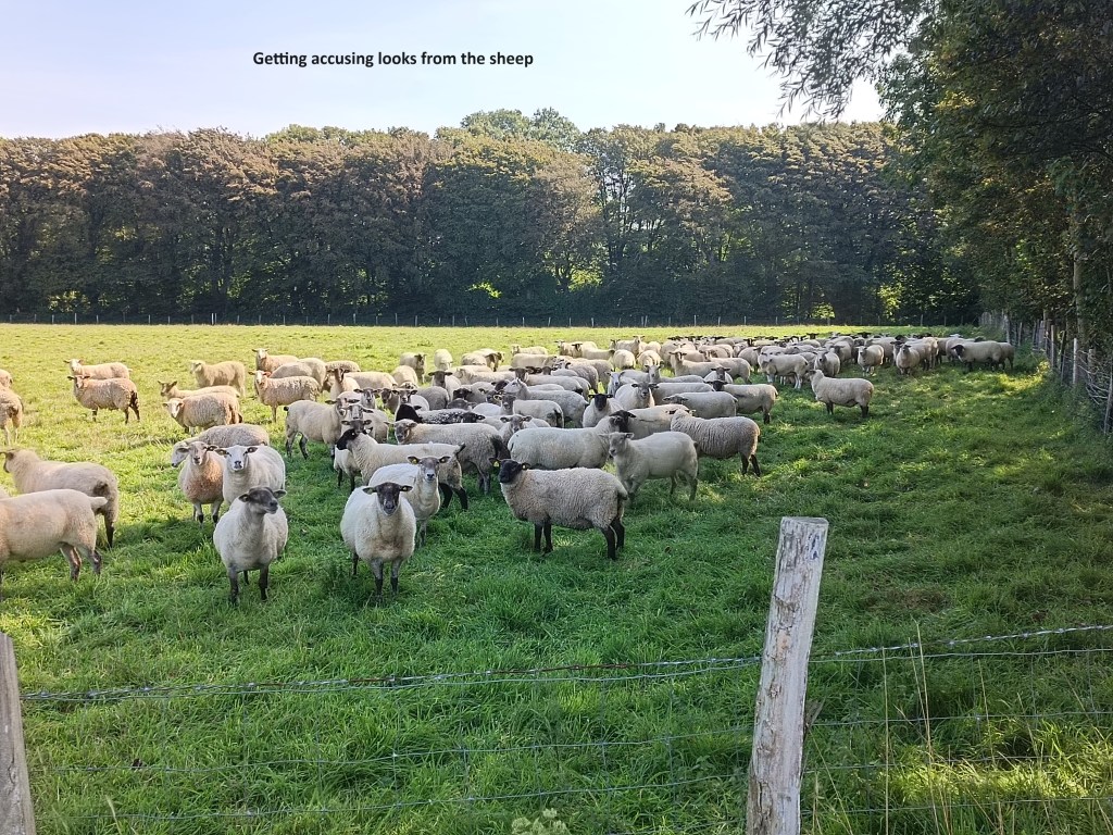 I came into the centre of Guines. It was mid-morning, the sun had been well up for a while, the clouds were gone, and I was thirsty. But I could not find a bar open. I even took a short detour to look for one, but to no avail. I made do with some water, and continued on my way. I went on up the hill and into the countryside. I came to the railway line where the trail turned left, going southeast. There was a small kink in the route to get over the railway line, a bend here and there, but the general direction continued south-eastwards for quite a while before turning south. I went through a forest, and emerged near the D248 road. The trail takes a long circular was to get to the east of the D248. I decided to follow the D248 directly. Along the way, I passed a herd of sheep, many of them giving me an accusing look. Shortly afterwards, I felt the road and went back into the forest.