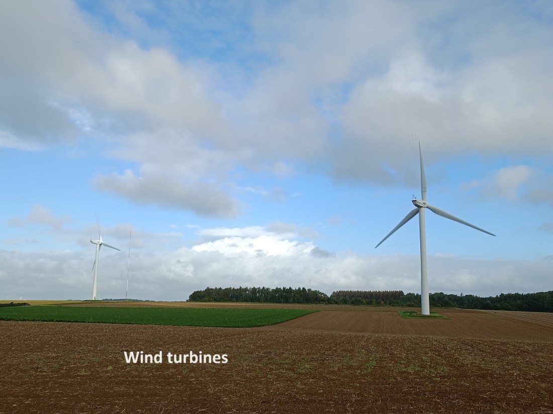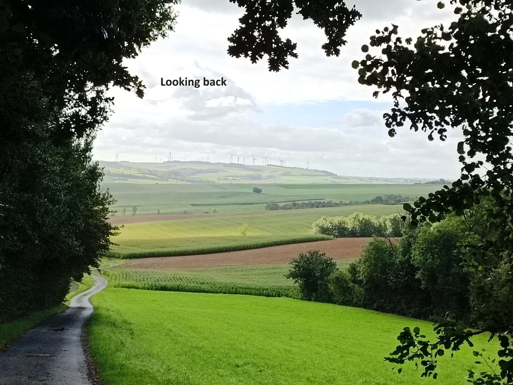 And so I came safely to Esquerdes. There were some businesses in the village just opening up as I got there. I went straight through the village, passing the church. I might have gone in had it not been closed. The trail takes a circuitous route around the western end of the village before going up the hill to the south. Not far out of Esquerdes, the route goes into a forest, emerging some distance later near the top of a small hill. The hill is flat, and it the site of several wind turbines. I went on over the hill and into the dip below to reach the hamlet of Crehem. Crehem is too small to have any amenities, so I wasted no time and kept going.