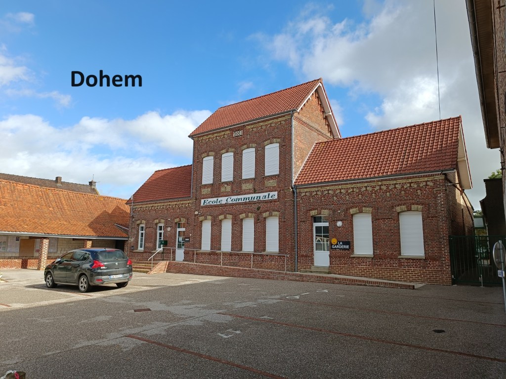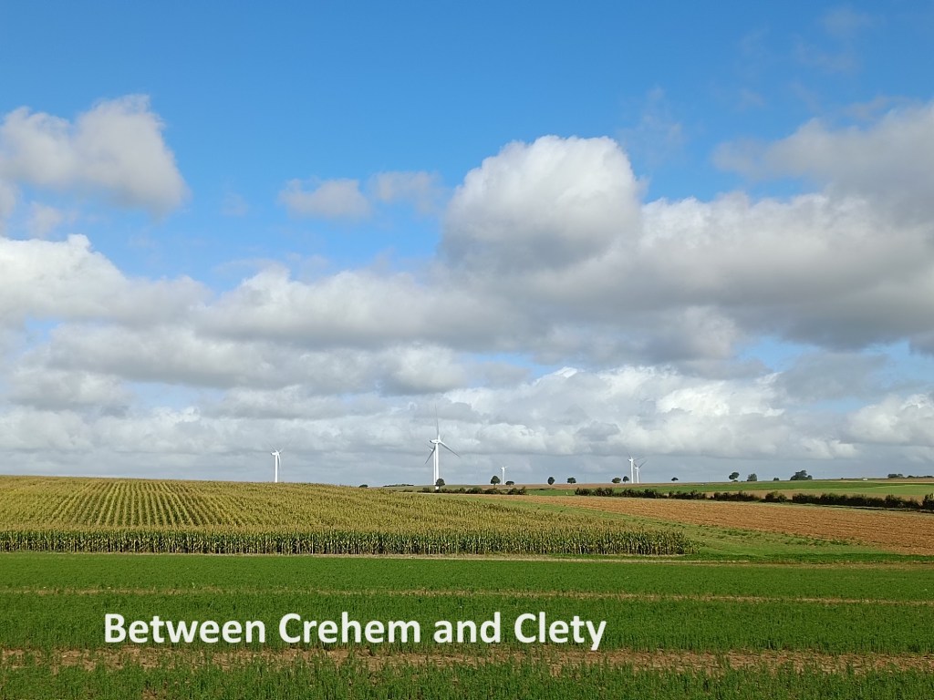 It had been a mixture of grey skies and blue from when I left Hallines pretty much all the way to Crehem, with clouds rolling in and patches of blue in between. After I left Crehem, the grey clouds finally dispersed, leaving just white puffball clouds here and there in an otherwise blue sky. I followed on along agricultural lanes, past cut grain crops, and corn waiting to be cut, until I reached Clety d’Aval. This is one of the outskirts of the village of Clety, if villages can be said to have outskirts. The trail does not go into Clety itself, but turns south and quickly comes to another village, Dohem.