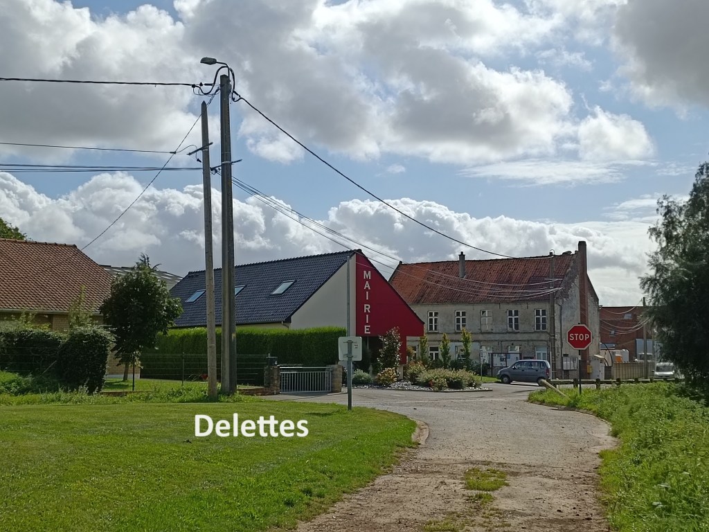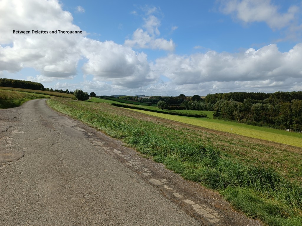 The trail goes around the eastern edge of Dohem, but I decided to go through the village. My only reward was to come across a small wayside shrine. In the centre of the village, there is a café beside the church, but both church and café were closed. A few kilometres later in Delettes, it was a similar story, and so I kept on going. After Delettes, the route goes to the higher ground to the south, and follows the Rue de Niettes, almost in a straight line to Therouanne.