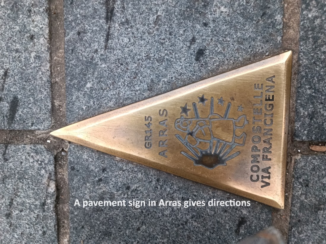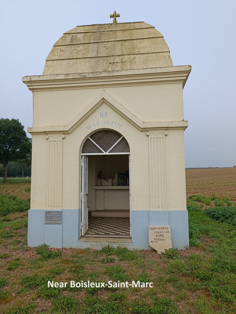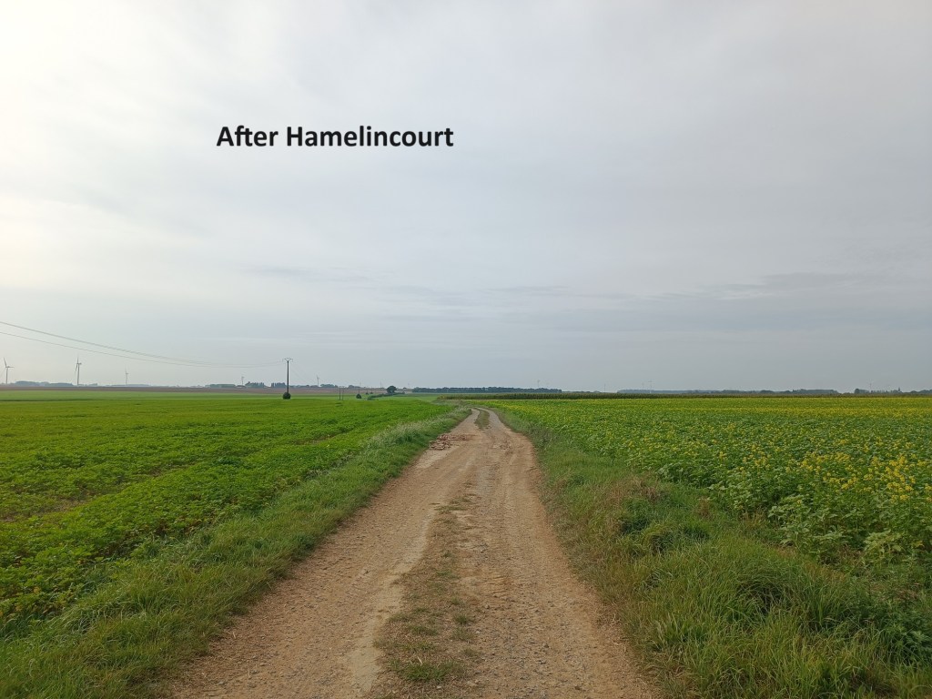 And then I was leaving Bapaume. On my way out of town, I was greeted by a couple out for a walk who asked me was I a pilgrim. I answered them yes. We talked about how far I had come that day, and how far I still had to go, which was not so much. The wished me “Bon courage”, and we parted.