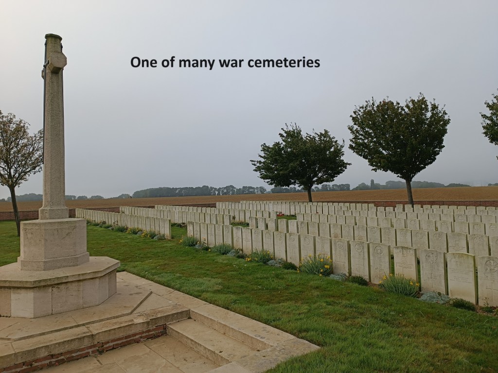 I was firmly into WW1 country now, as evidenced by the number of military cemeteries that I passed, and signs for others that were off the route. The cemeteries up to this point were all for fallen allied soldiers. I had seen a large cemetery at Éscoivres, but now I was passing smaller ones, with perhaps 100 graves in them. Such is the folly of war that so many died for so little.