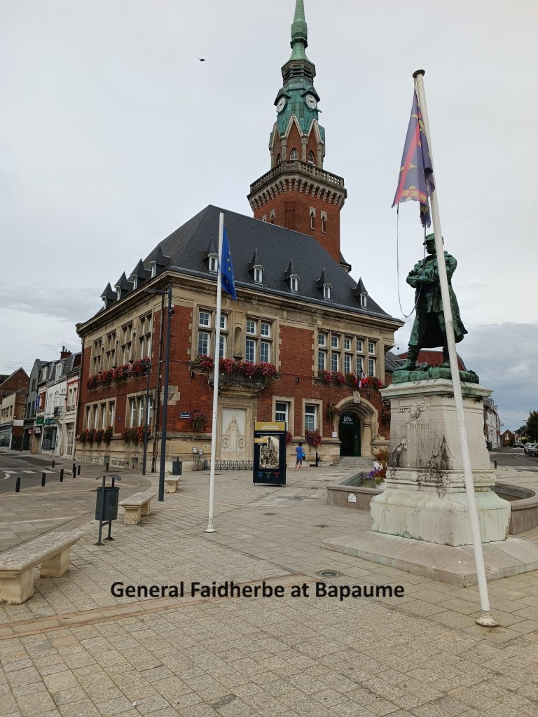 In the centre of Bapaume, there is a statue of General Faidherbe. He commanded French armies in the Pas de Calais area during the Franco-Prussian war of 1870-71. In January 1871, the inexperienced French troops under Faidherbe marched out against an outnumbered but experienced Prussian army. The French won the day, but did not follow up, leaving the Prussians to march on towards Paris. After achieving their strategic victory, the Prussians turned again against Faidherbe’s troops and defeated them decisively at Saint Quentin. Neverthelss, it is the victory of Bapaume that the French chose to remember, and Faidherbe was regarded as a hero. He was later elected to the French parliament. During WW1, the statue was knocked down and melted by the German armies who believed it to be bronze, which it was not. A replica was installed in 1929, though it bears the marks of shrapnel from WW2.