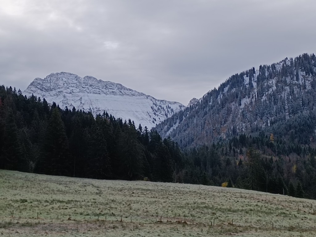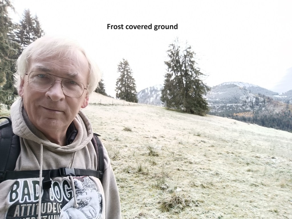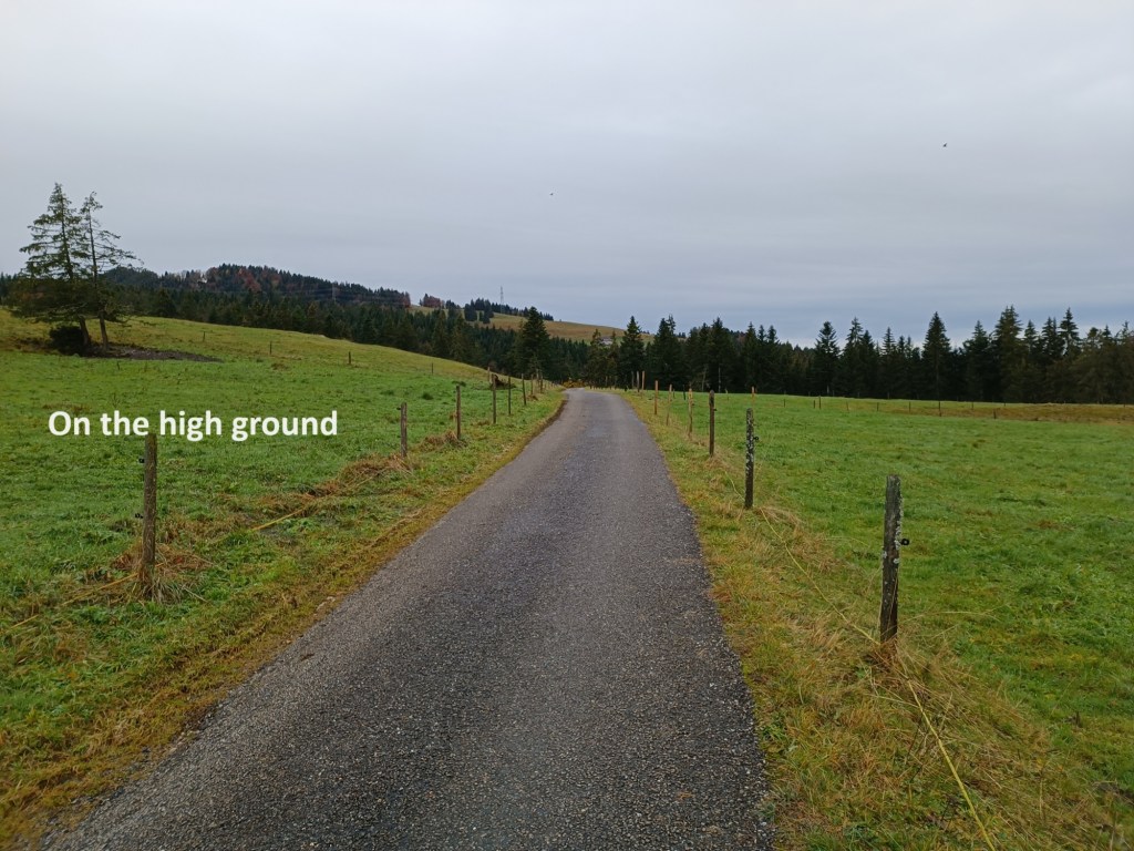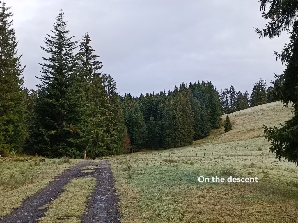 I got off the bus in Les Paccots and immediately started walking. From the bus stop, it was a short walk to get back on the trail. The route follows the road out of town, going uphill. After a little while, I had passed all the private houses and vacant ski chalets, and I was on the edge of the village. The ski lifts were quiet as I went over the hill; all the snow that was there on my last outing was gone. I went on over the hill above the village and started the descent. Just over the brow of the hill from the village, the trail leaves the road and takes to the woods and fields. This was at about 1100m, and there was still a heavy frost on the ground. As I went downhill, it did not take long until I was in green grass with no frost anywhere.