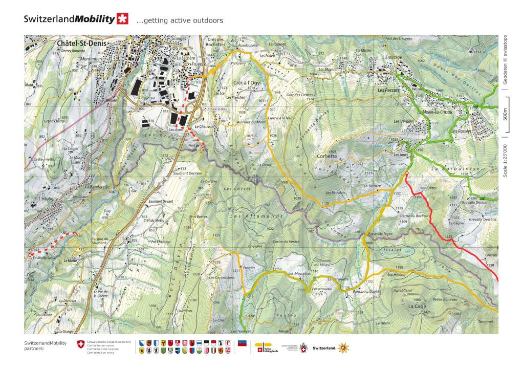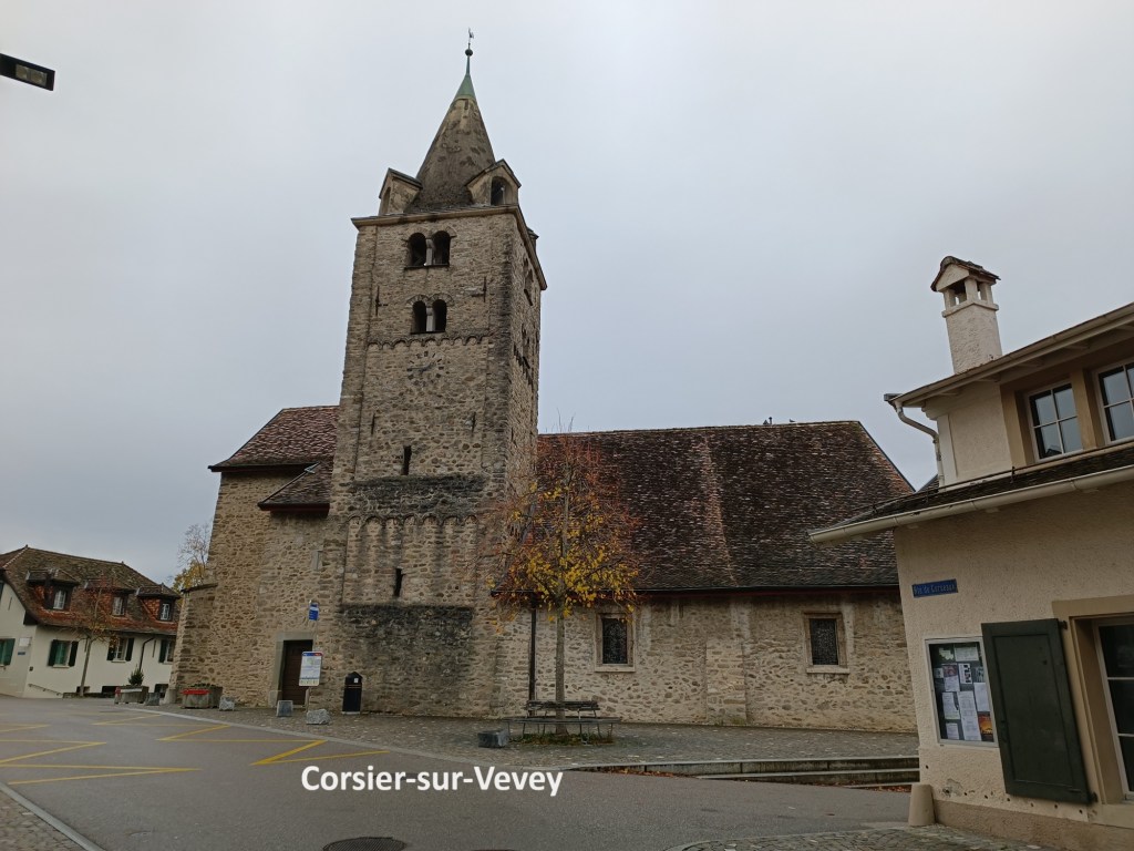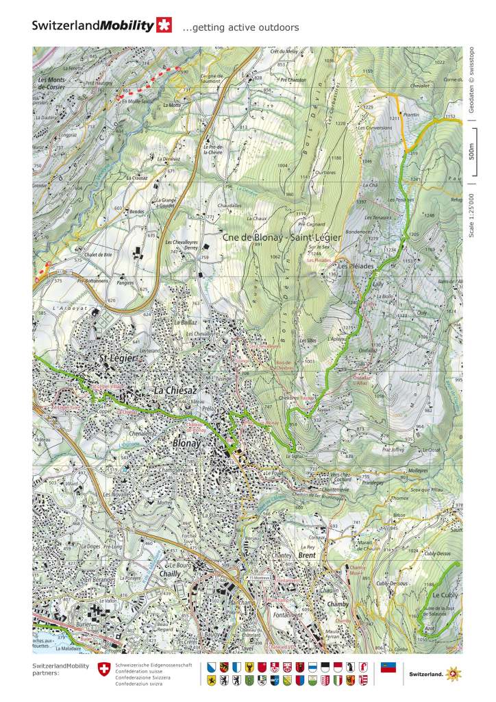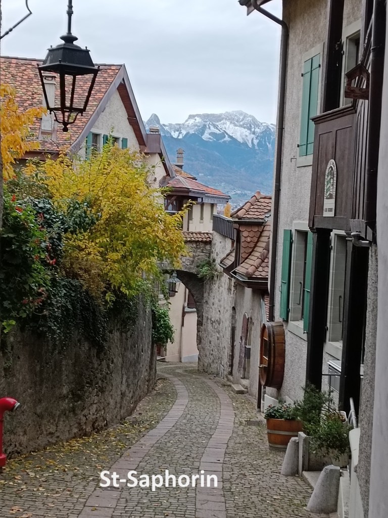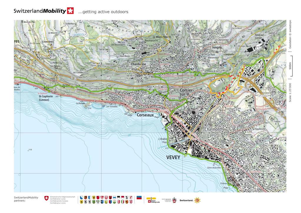 I followed the trail on westward from Blonay. It more or less follows the railway line as far as St-Legier, and then takes to the roads, crossing a motorway to get the to valley of La Veveyse. There, the trail takes to the woods and goes south. The standard route is blocked due to maintenance work, and the alternative effectively takes three sides of a rectangle to get to the other side of Corsier. I chose a different route, going directly into Corsier, and meeting up with the Swiss Via Francigena near the centre of the village. I followed that route on westwards and the Alpine Panorama trail rejoined the Via Francigena just a little west of Corsier.