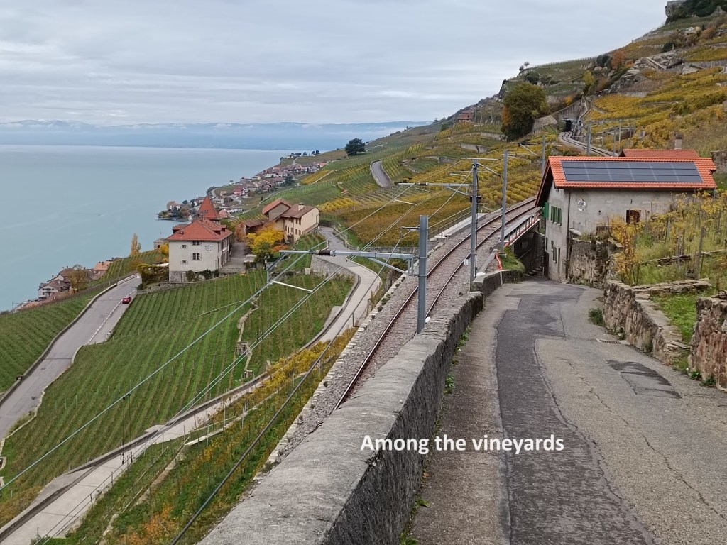 Charlie Chaplin lived in Corsier from 1953 until his death in 1977. He is buried in the local cemetery. There is a Chaplin Centre in the village, and some of the residential buildings are decorated with murals of the actor. James Mason is also buried in the local cemetery. But these dignitaries were not the reason for my being there, and I continued on. It is not far from Corsier to Corseaux, which is nominally the end of this stage of the trail. Nominally, it ends at the junction of the two trails. But I had a mind to go further. From Corseaux, I would have to get to a train station, which would be off the trail, so I figured that I might as well continue. The trail went up the hill a little, and soon I was walking through vineyards. The fruit has all been picked at this stage, and the vines were bare. After a little while, the trail descended again, reaching the lake shore at Saint-Saphorin.
