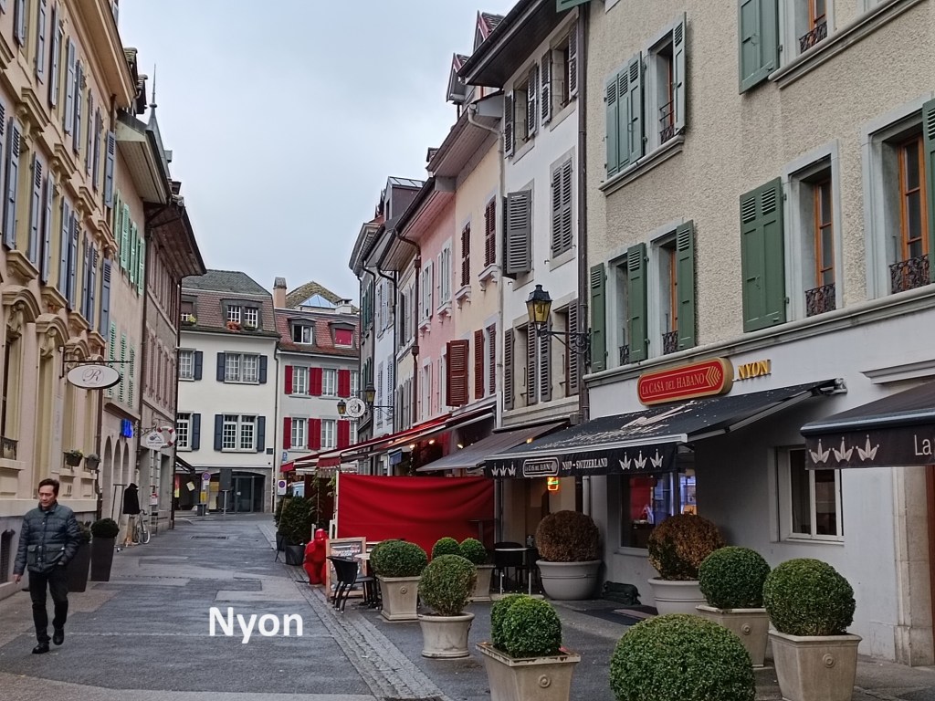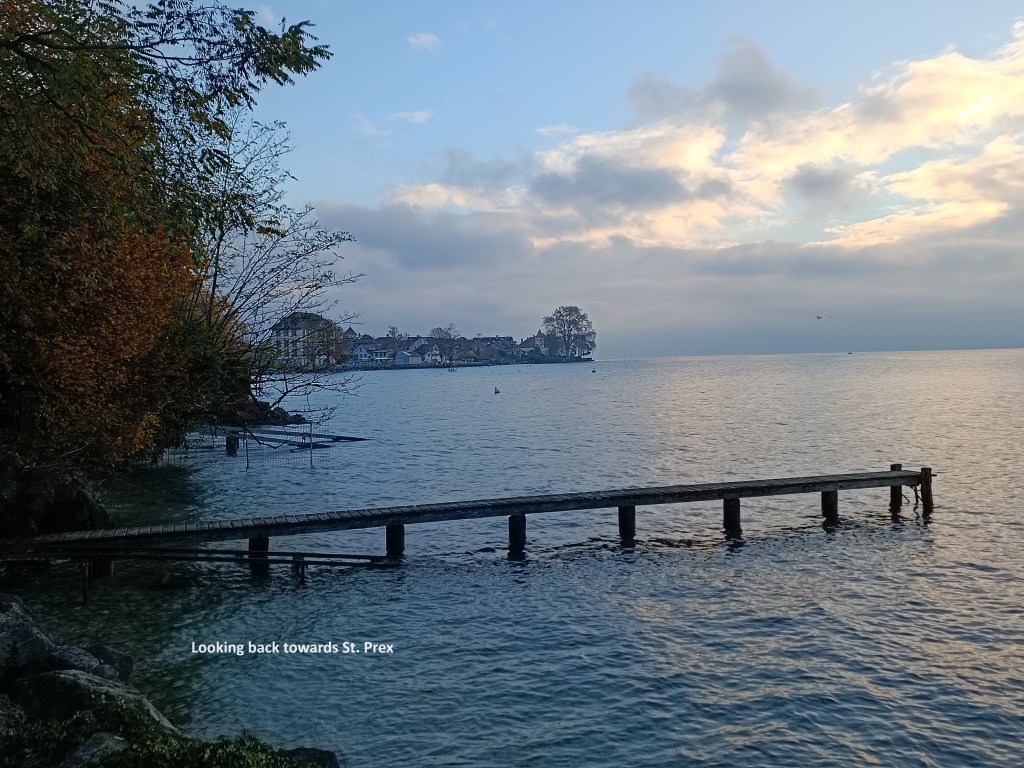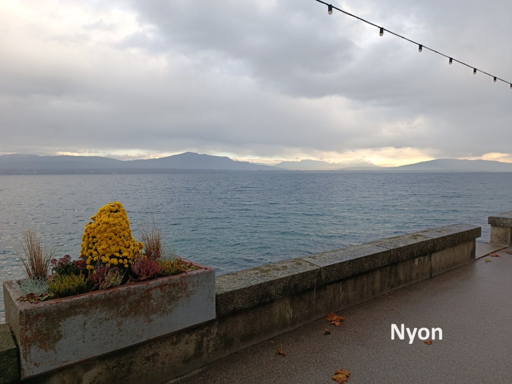 I contemplated stopping in Nyon, but that would leave me with a very long walk on the next stage of the trail. For that reason, I kept on going. I followed that main road on through Prangins to there it reached the lake shore in Nyon. In Prangins, the two official trails, back from their meanderings crossed the main road again to go into the centre of Nyon and the railway station. But with my decision to go on past Nyon, I stayed on the shoreline. The streets were mostly deserted, and the promenade completely so. The day was developing a very wintry feel.