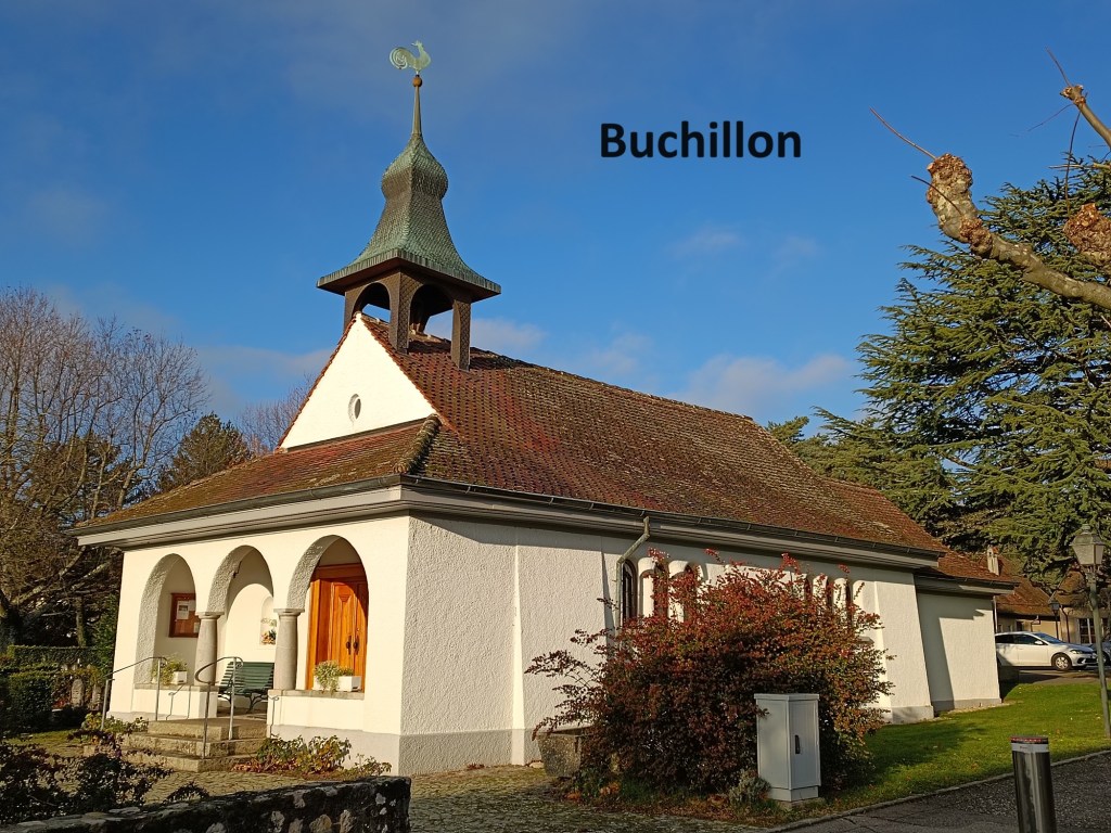 After that, the route turns north again, but only as far as a small road, which it then follows westwards, ever westwards. The village ends, and then there were some fields, even a couple of small streams to cross. That brought me to the village of Buchillon with its small church. I have come this way before, and then the church was open, but today, it was closed.