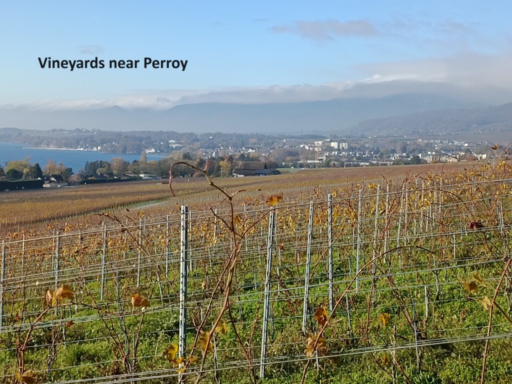 That route meanders around the countryside, passing vineyards that had long since been harvested and were almost bare of leaves, before reaching the village of Perry. I went on through Perry, following the trail back to the shore and on into Rolle. I did indeed get lunch there, in a little pizzeria opposite the castle.