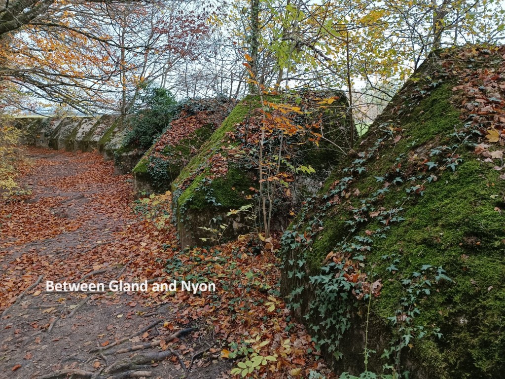 In Rolle, the official trail follows the shoreline, but I chose to follow the main street. I emerged from the western edge of the town and was back into countryside. I followed the trail through some zig-zags across the La Gilli ere. I went on through Bursinel and Dully. After these villages, Gland was a bigger town, but with nothing of note along the trail there. After Gland, the route turned south again, passing a long line of anti-tank obstacles dating back to the Second World War.