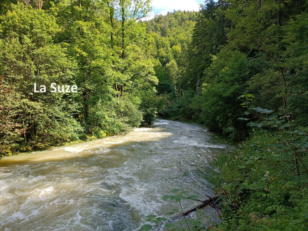 I was following a different river now: La Suze. The valley forces it into a narrow channel, fast flowing, and tumbling over small cascades where it has been harnessed for power. I emerged into open fields at the Métairie de Nidau. I met another walker coming the other way, and we stopped and chatted. It turned out that he was an immigrant to Switzerland, like myself, but from Denmark. His German and my French were both limited, but we managed to converse. He advised me on the route, and we each went each on our way.