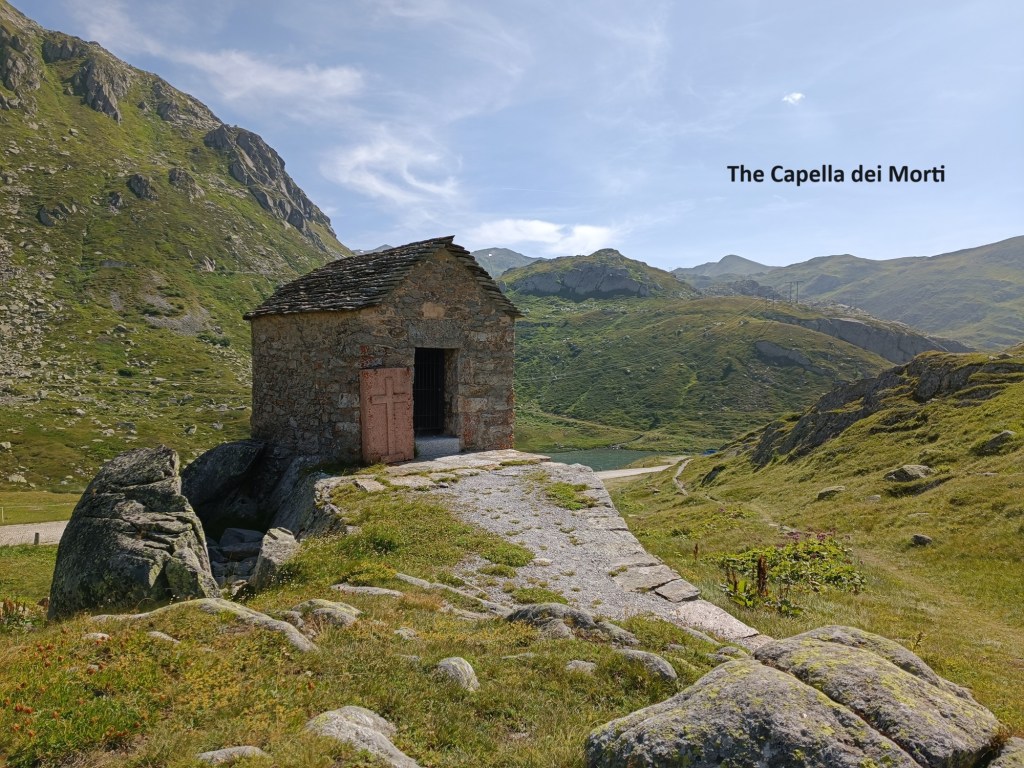 Just before arriving at the pass itself, there is a Capella dei Morti, a little stone church built in memory of the soldiers who died in the clashes between the Russians and the French. Suvorov lost about 1,200 men in reaching the pass. Just after the Capella, I came to the pass itself. There is what is referred to as the hospice at the pass, which dates from before Suvorov’s time. I suspect that it was more like an inn for travellers than what we would consider a hospice today. I chose to avail of one of the mobile food sellers catering for lots of car and motorbike tourists, and a few hikers.