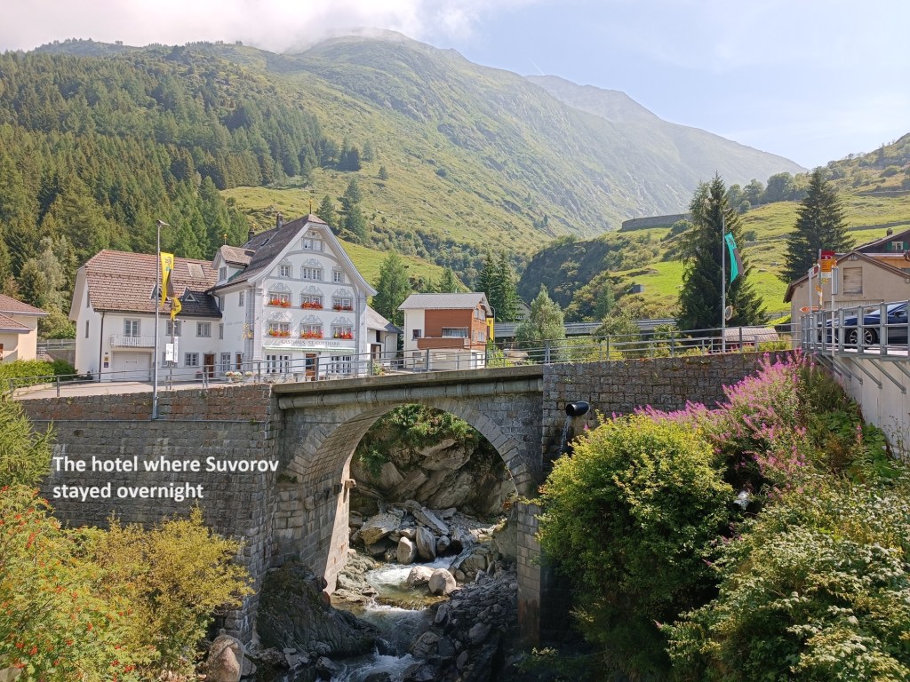 The trail went on down gradually over moorland until the farmlands until the village of Hospental came into view. Suvorov’s men had another fight with the French here, with the French troops withdrawing westwards towards the Furka Pass. Suvorov camped his army overnight, taking food from the local population, which the people could ill afford to give. Suvorov himself stayed overnight at the St. Gotthard inn, which is still standing and still in operation as a guesthouse today.