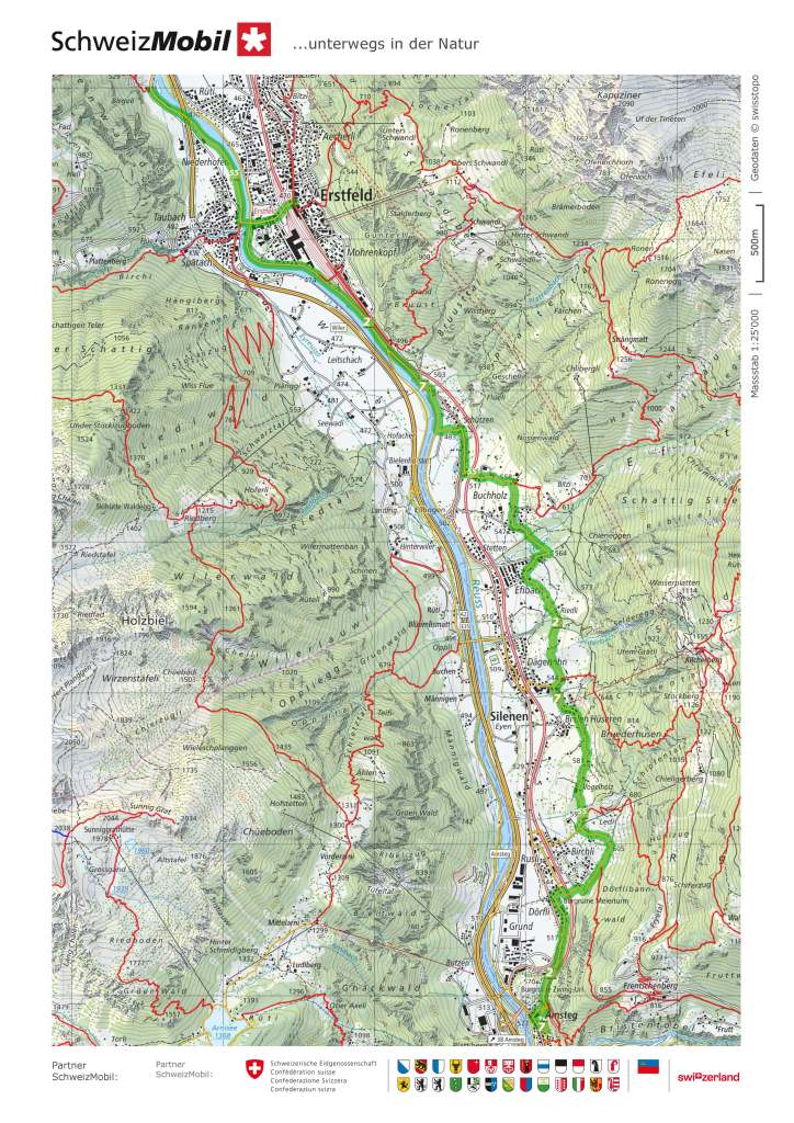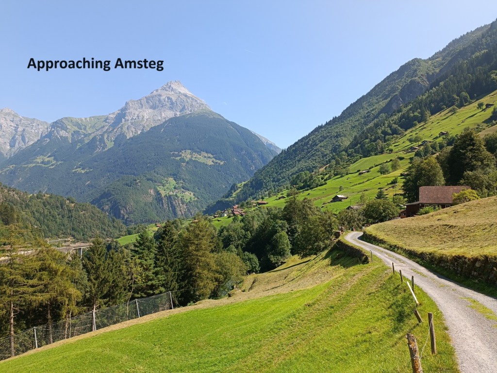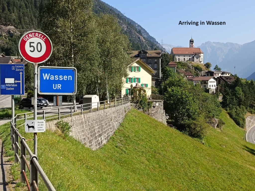 Eventually, the valley opens out, and the route becomes more gentle. It still follows its own way, almost ignoring the road. I was hoping for refreshments in Amsteg, but everywhere was closed. Going on, I passed the ruins of the Zwing Uri castle. Its destruction dates to the early days of the Swiss Confederacy, and it has almost disappeared into the landscape. The road bypasses the village of Silenen, but the trail goes through it, passing the Susthaus and the Meierturm. The Susthaus dates to the late sixteenth century when Silenen was a staging point on the trade route over the Gotthard Pass. Goods could be stored there, animals fed and watered, and the travellers catered for as well. The Meierturm was the residence of the Zürich nobles assigned to oversee the village and the surrounding area.