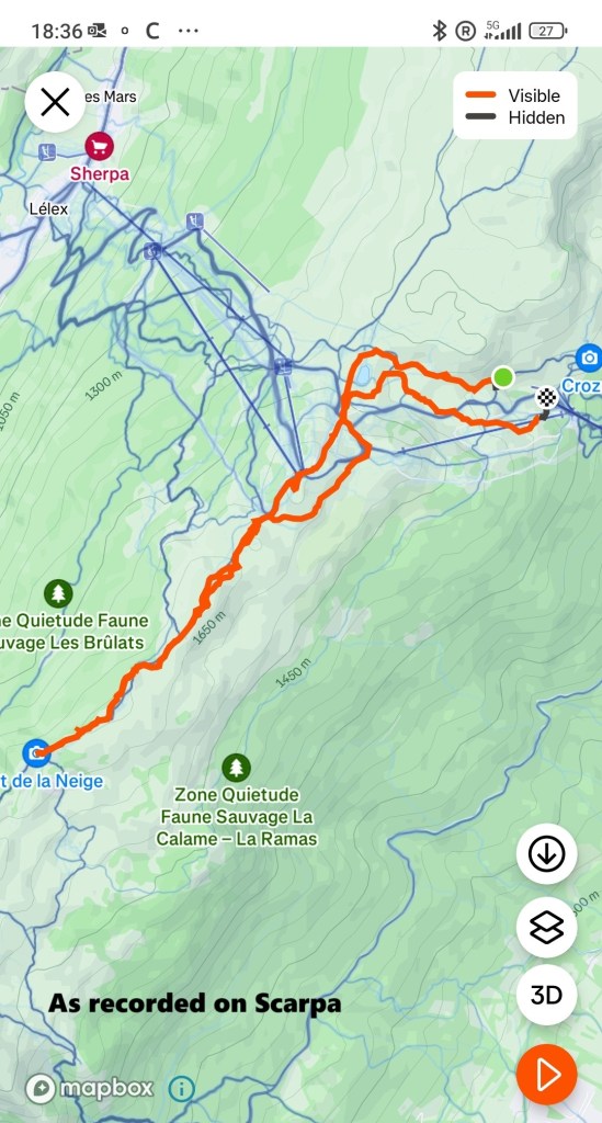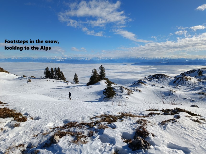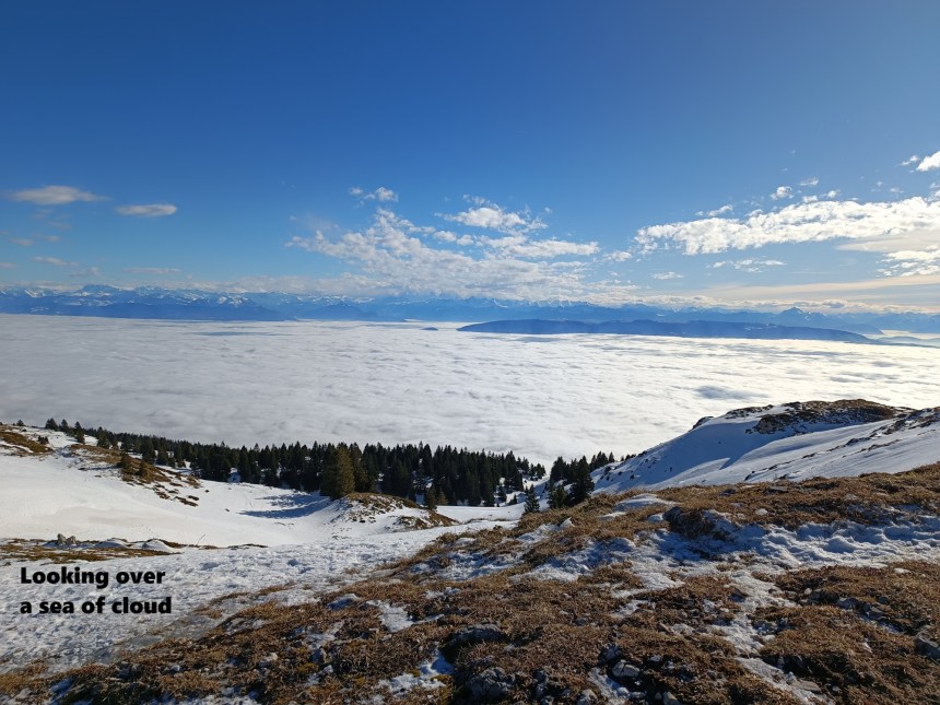 There is an extensive network of tracks near Le Fierney, and it was my intention to follow these in an arc that would bring me to Montoisey. I started out well enough. though I was soon in snow. The snowshoes came out and I kept going, with a marvellous view of the clouds over Lac Léman as I went. Unfortunately, the snow made the tracks invisible. My phone had no signal, and I was reduced to dead reckoning to find my way. But Montoisey was visible in the sunshine, and I got there. There is another ski lift station there, bringing people up from the western side. I followed the ski route down to the col just below Montoisey. At that point the ski route turns westwards, while I was going on the Grand Crêt. I had left the skiers behind, and I was into walking territory now.