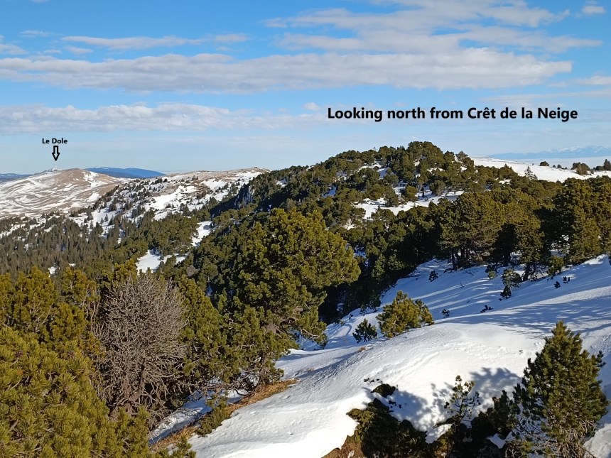 There were plenty of walkers out that day, not all following the same route, but generally going to or coming from Crêt de la Neige. The snow was good underfoot, but it would have been difficult without the snowshoes. After an unnamed hump in the ground at 1663m, the route descends slightly before going up to Grand Crêt at 1702m. The map shows the ground as more or less level from there to Crêt de la Neige, but it is not so. These mountains are made of limestone, with lots of dips and hollows. I am quite sure that they are a delight in early summers, as those dips and hollows would be perfect for alpine plants. But in the snow, the route twists its way around them, sometimes going up slightly, and sometimes descending slightly. On the final piece just before the summit, there is a particularly narrow section between two good sized hollows, and care had to be taken. But I got there, and it was worth it. The views to the west and north were fabulous, with La Dôle clearly visible.