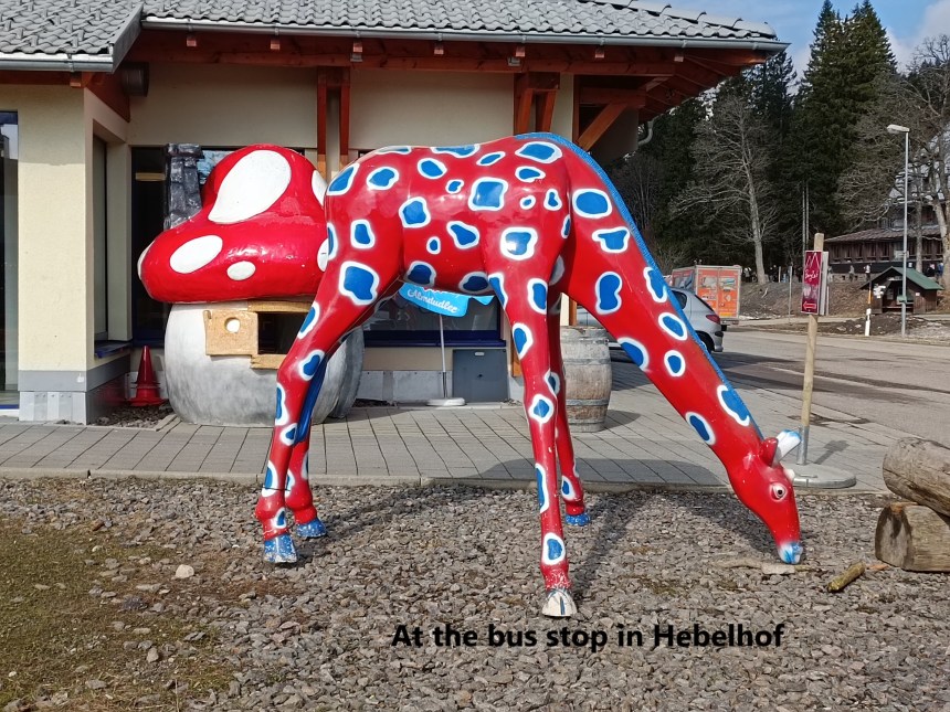 And then it was time to make my way back to Hebelhof. There are trails marked on the map, but I had difficulty following them. There are other trails, used by the foresters, and they led me astray. The GPS was not entirely reliable, and I found myself walking through the snow to get back on the right track towards Grafenmatte. This was soft west snow. It actually reminded me of a similarly named mountain in Switzerland, Grafimattstand, where I had some difficulty a couple of years back. The snow evens out the ground, so that on one step, you can be in snow barely 10cm deep, and with the next step your foot plunges 50cm into the snow. But I got back on the right track eventually, and went over Grafenmatte towards Hebelhof below. And once I reached Hebelhof, all I had to do was to wait for the bus to start the journey back to Basel